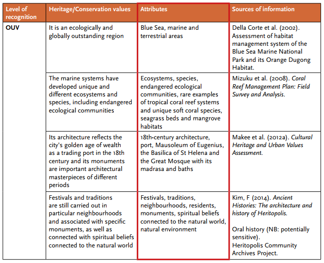 Tool 1 and attributes was designed to help identify the attributes that convey the Outstanding Universal Value of a . In Tool 1, the third column lists all the attributes, as shown in Table A2.1.