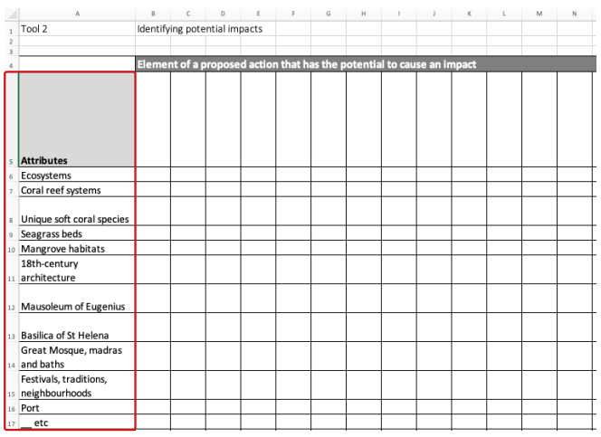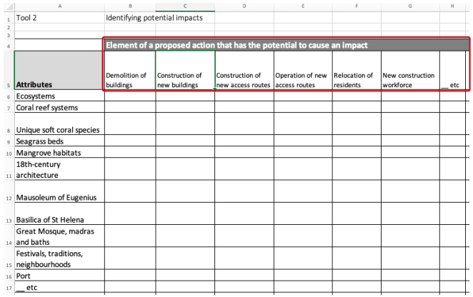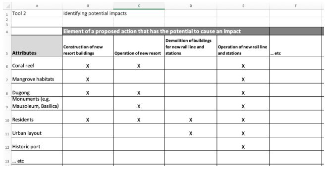 The purpose of this tool is to illustrate a step-by-step approach to identifying impacts which might arise when an element of a proposed action interacts with one or more attributes of a World Heritage property. The tool is provided as a general template to suggest one of many possible approaches, and it may be further adapted and improved as appropriate.