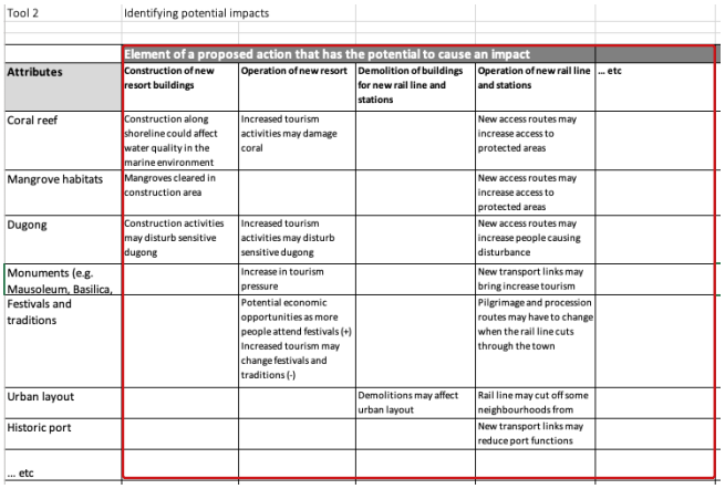 Each potential interaction between an element of the proposed action and an attribute should be noted in Tool 2. This ensures that the proposed action has been systematically analysed at each stage, thereby identifying the full range of its potential impacts.