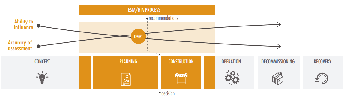 There are multiple stages in the development and implementation of a proposed action (Figure 4.1). An impact assessment needs to take place early enough to be able to influence planning: the later an impact assessment takes place, the less potential it has to influence the outcome. The final impact assessment report needs to be ready in time to help inform the decision on whether the proposed action should proceed, be modified or not be carried out at all – before construction or any other preparatory actions on the ground take place.