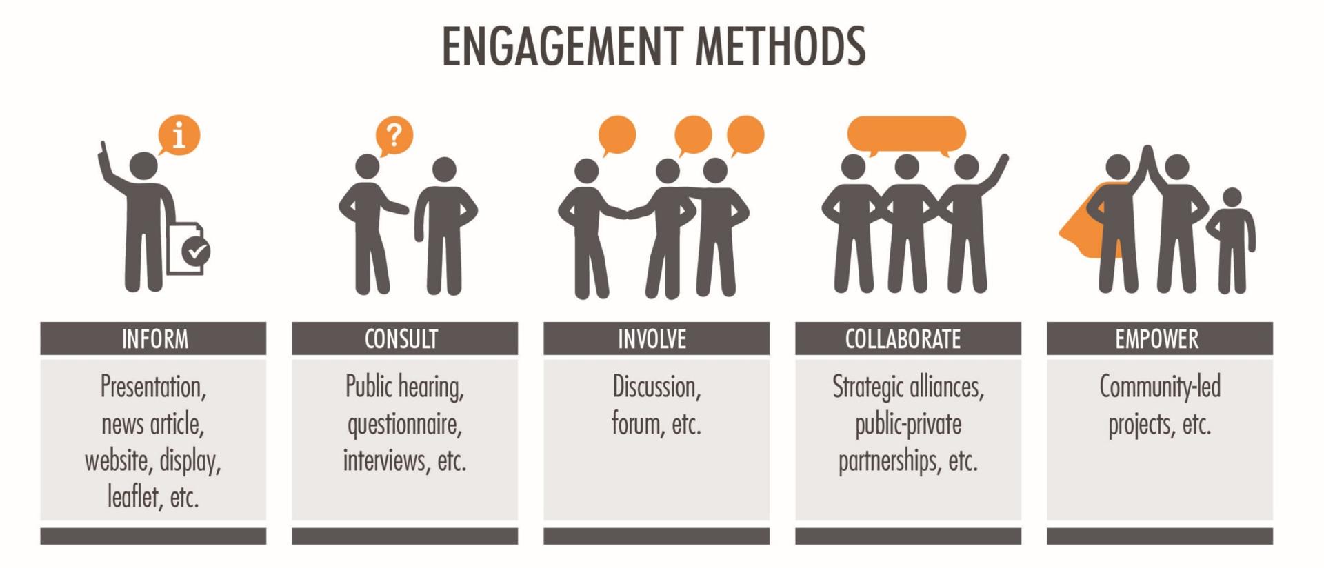Engagement techniques include running workshops to identify baseline data and identify/assess alternatives; involving local residents in a decision-making panel; or at a minimum, providing and clarifying information about the proposed action and its impacts, with an opportunity to comment.