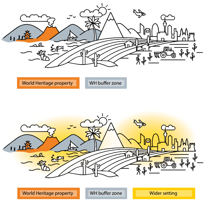 Every is surrounded by a wider setting, which is the immediate and extended environment that is part of, or contributes to, its significance and distinctive character. It may relate to the property’s topography, natural and built environment, and other elements such as infrastructure, land use patterns, spatial organization and visual relationships. It may include related ecological and hydrological connectivity, social and cultural practices, economic processes and other intangible dimensions of heritage such as perceptions and associations. The wider setting might also play an essential role in protecting the authenticity and integrity of the property, and its management is related to its role in supporting the Outstanding Universal Value.